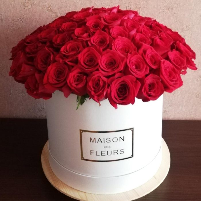 Роза – 101 шт. Коробка шляпная – 1 шт. Оазис флористический – 3 шт.