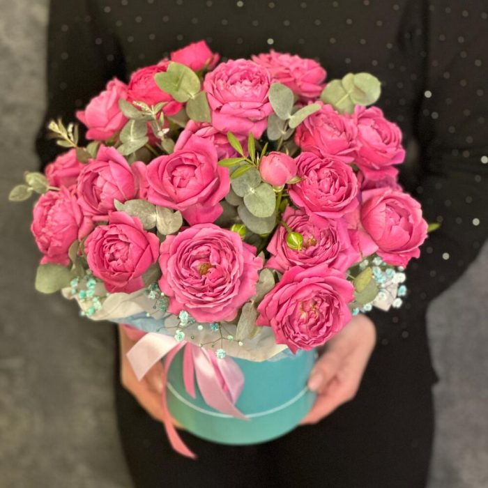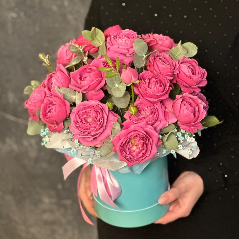 Композиция из ароматных малиновых кустовых пионовидных роз с добавлением веточек эвкалипта и гипсофилы в стильной шляпной коробке цвета Тиффани и атласными лентами