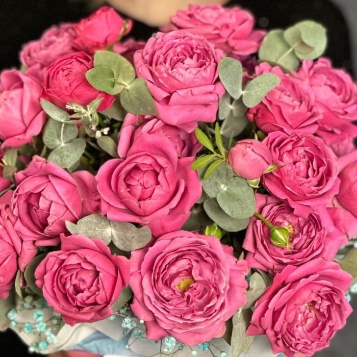 Цветы в коробке кустовые пионовидных розы с эвкалиптом