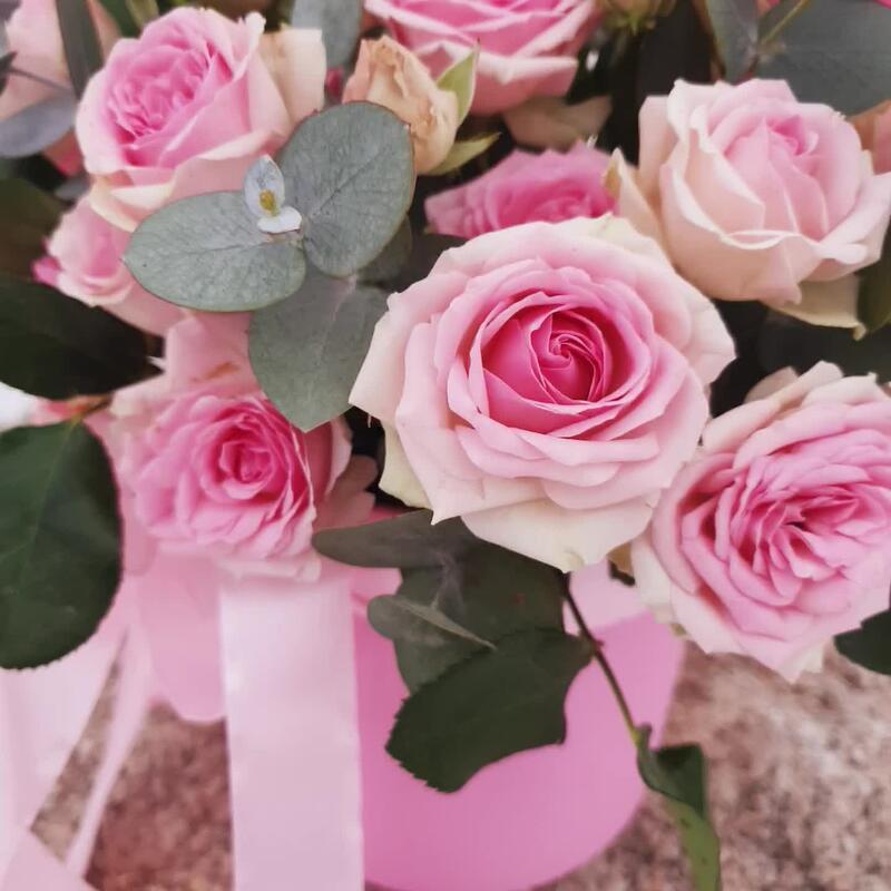 Эвкалипт – 3 шт.Лента атласная – 1 шт.Коробка шляпная – 1 шт.Роза кустовая пионовидная – 5 шт.Открыточка с вашими пожеланиями – 1 шт.Оазис флористический – 1 шт.любовь флориста (бесплатно) – 1 шт.