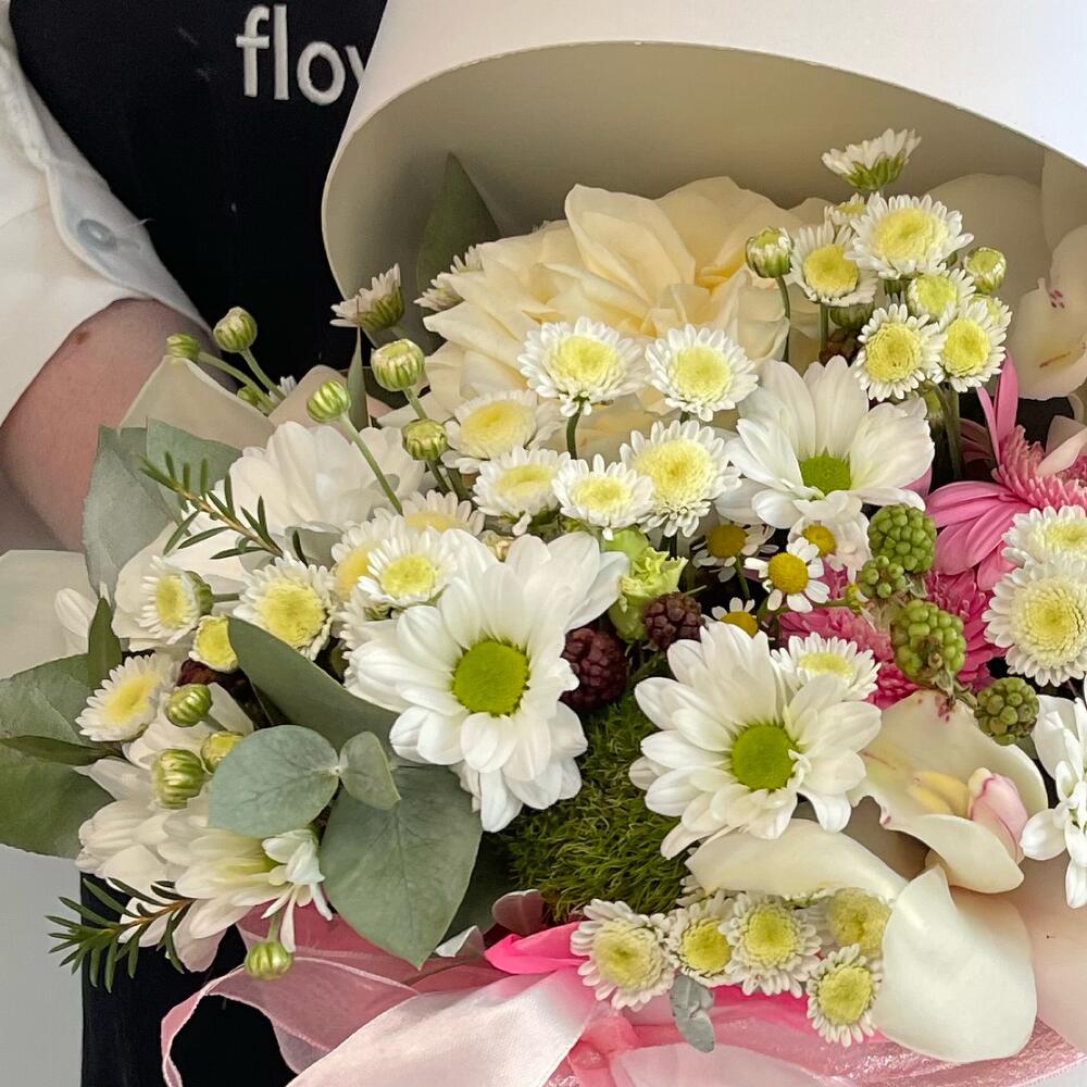 Коробка шляпная – 1 шт.Лента атласная – 2 шт.вибририниум – 1 шт.Роза кустовая – 3 шт.Лизиантус – 1 шт.Рубус – 1 шт.орхидея – 3 шт.white o’hara – 1 шт.Хризантема кустовая – 2 шт.Гербера мини – 3 шт.