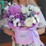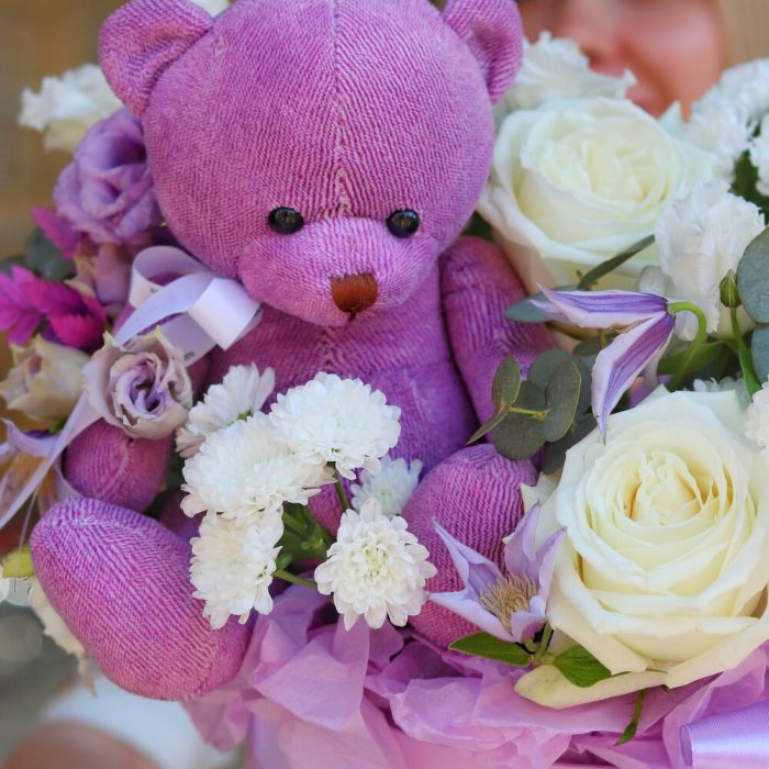 Нежная, чувственная и воздушная композиция с мишкой, выполненная из пионовидных роз, лизиантуса, клематиса, сантини и других не менее интересных цветов.А сиреневый мишка, который входит в состав композиции, сделает Ваш цветочный подарок ещё более уникальным и индивидуальным!Такая композиция точно понравится яркой и энергичной получательнице, и будет долго радовать её.К композиции прилагается открытка с вашими пожеланиями и приятный комплимент от нашего магазина – шоколадка.Мы также будем рады отправить вместе с композицией конфеты, шоколад ручной работы или б/а вино по вашим пожеланиям, просто напишите нам в личные сообщения. Заказывая нашу композицию, Вы всегда получите исключительный сервис и заботу о клиенте