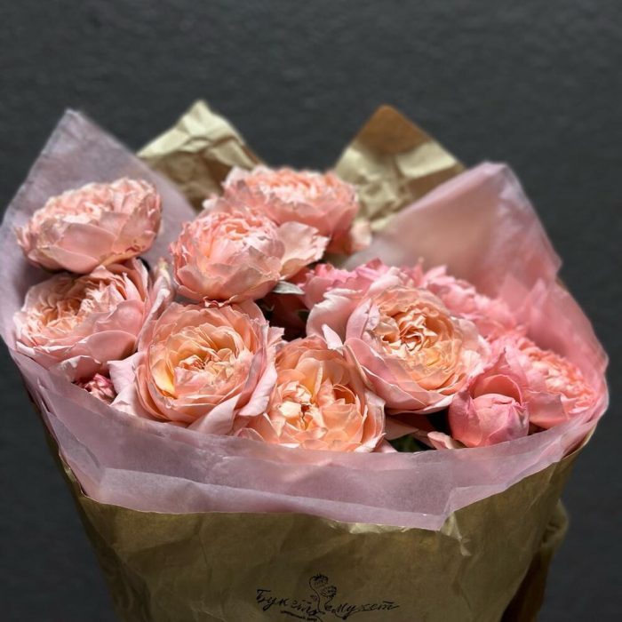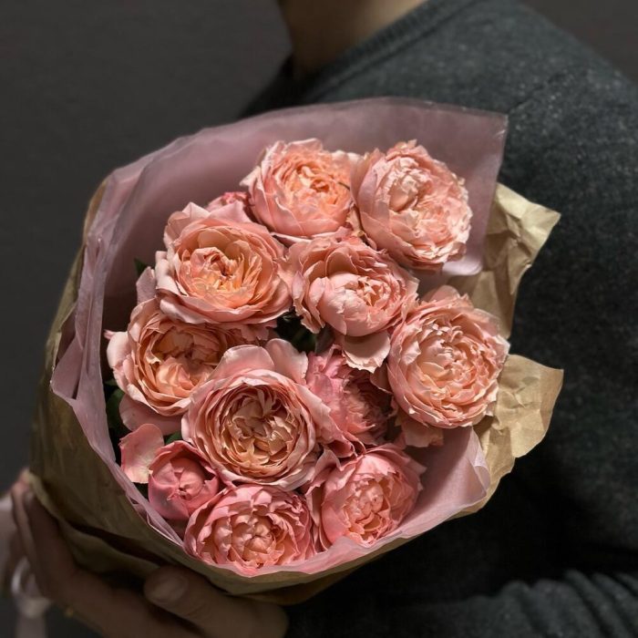 Лента атласная – 1 шт.Тишью – 2 шт.Крафт – 1 шт.Роза пионовидная Джульетта – 3 шт.