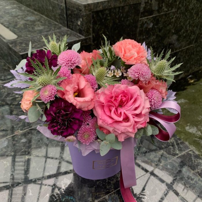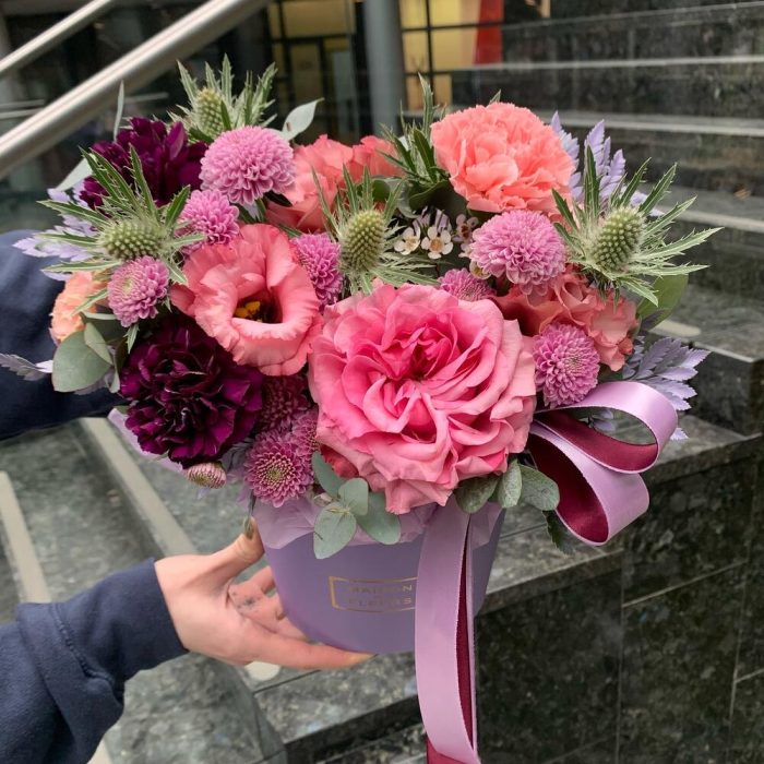 кантри блю пионовидная роза – 1 шт.диантус черничный – 2 шт.Диантус розовый – 1 шт.Лизиантус – 1 шт.Сантиния – 2 шт.Эрингиум – 1 шт.Ваксфлауэр – 1 шт.