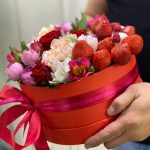 Альстромерия – 3 шт.Гортензия – 2 шт.Клубника – 9 шт.Роза красная – 5 шт.Оазис – 1 шт.Коробка – 1 шт.Пирожные макарон – 3 шт.роза мисти бабл – 2 шт.