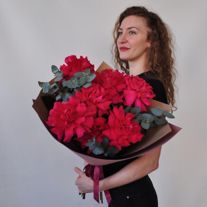 Эвкалипт – 1 шт.Лента атласная – 1 шт.Крафт – 1 шт.Роза французская пионовидная – 7 шт.Фоамиран (упаковка) – 1 шт.
