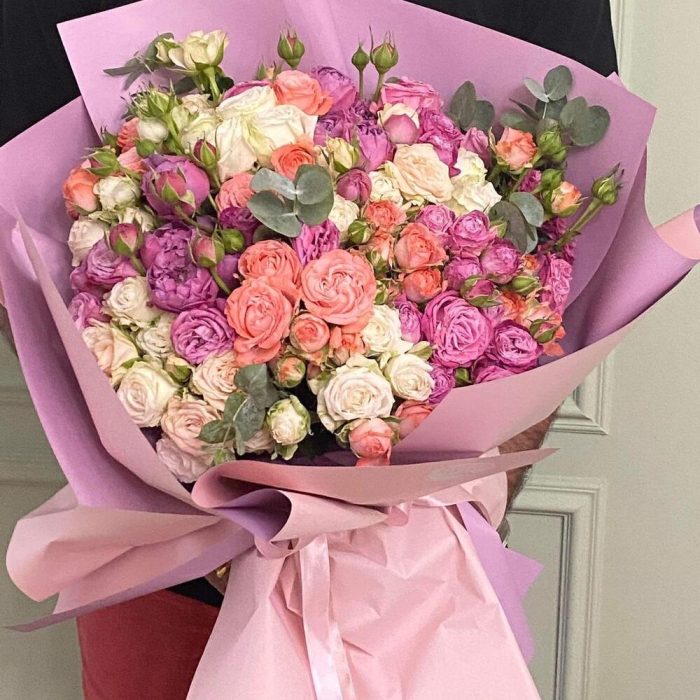 кустовые пионовидные розы – 51 шт. Упаковка дизайнерская – 5 шт. Атласная лента – 2 шт. Открыточка с вашими пожеланиями – 1 шт.