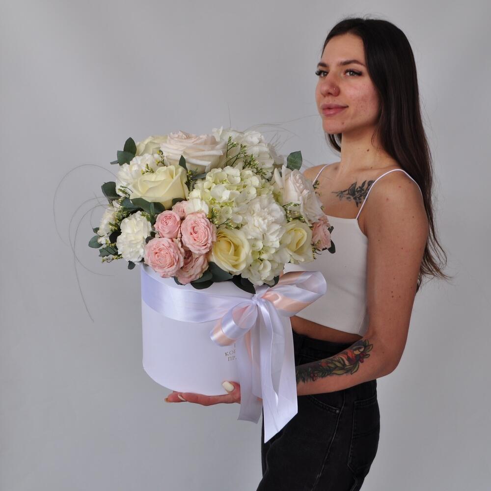 Гортензия и пионовидные розы Охара в большой коробке “Белоснежка”