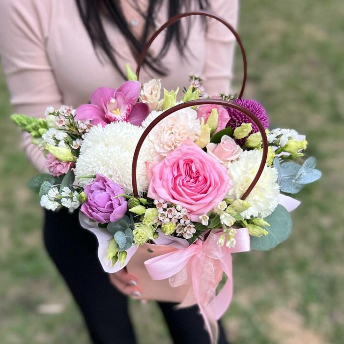 Лимониум – 1 шт.Эустома – 1 шт.Роза пионовидная – 1 шт.Хамелациум – 1 шт.орхидея – 1 шт.Тюльпан пионовидный – 1 шт.зелень эвкалипта – 1 шт.хризантема одноголовая игольчатая – 1 шт.хризантема шаровидная одноголовая густав – 1 шт.