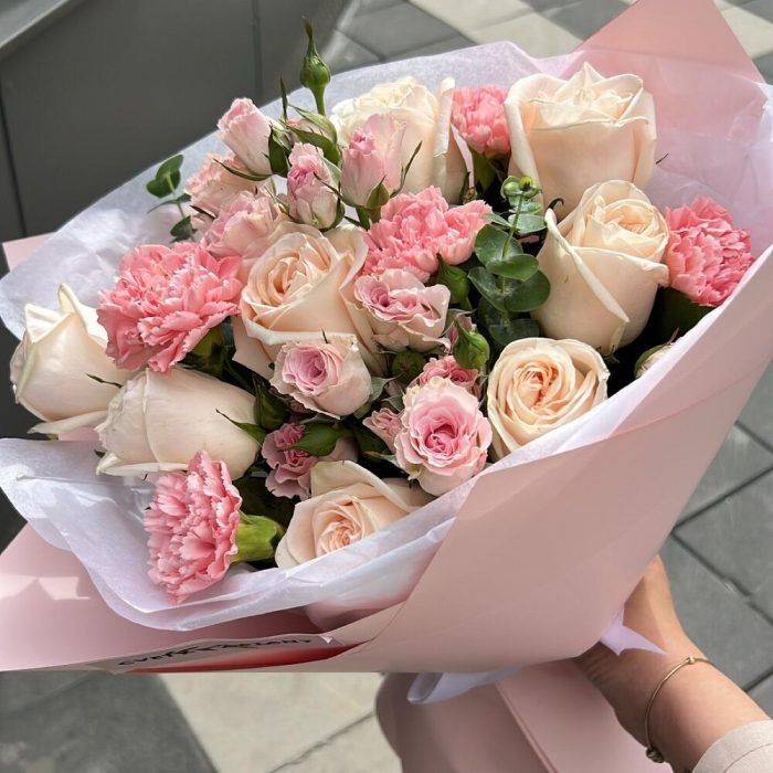 Гвоздики, Лизиантусы, Розы, Тюльпаны