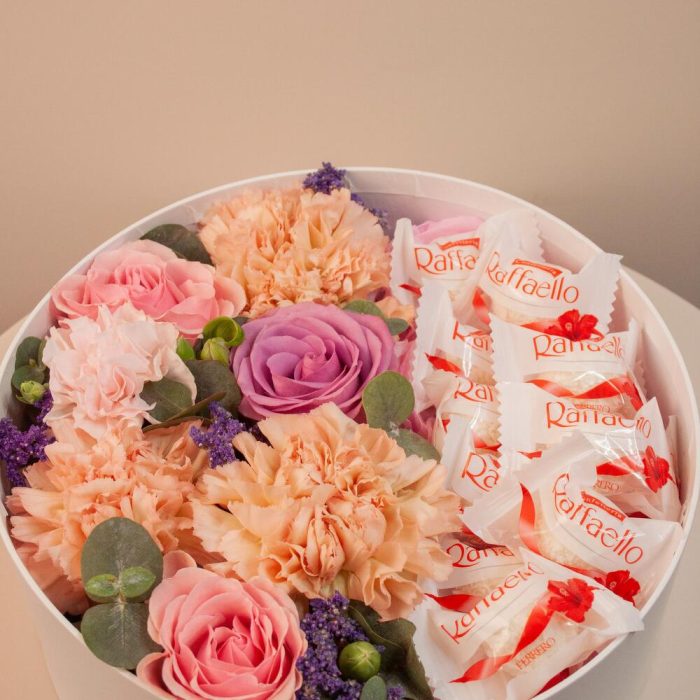 “Сладкое сердце ” – цветочная композиция с сладостями в коробке “Сердце”