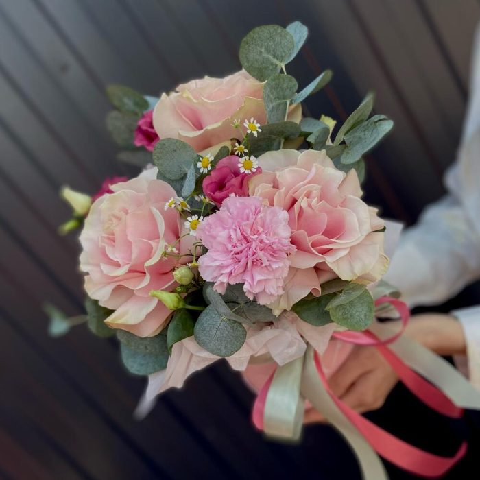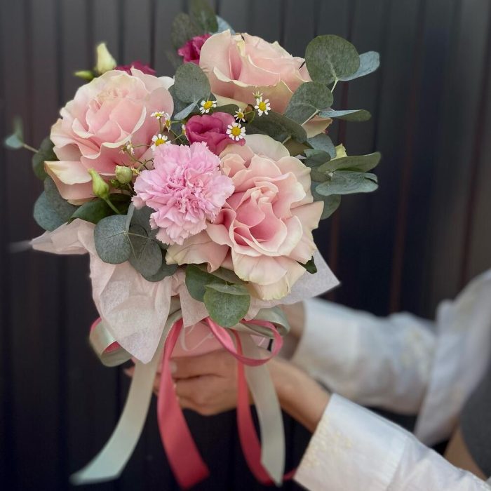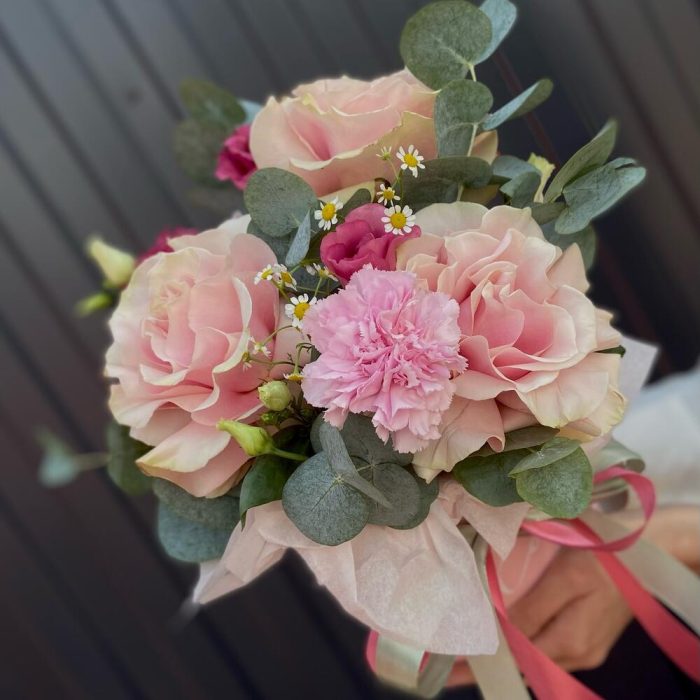 Категории: Гвоздики, Лизиантусы, Розы, Ромашки