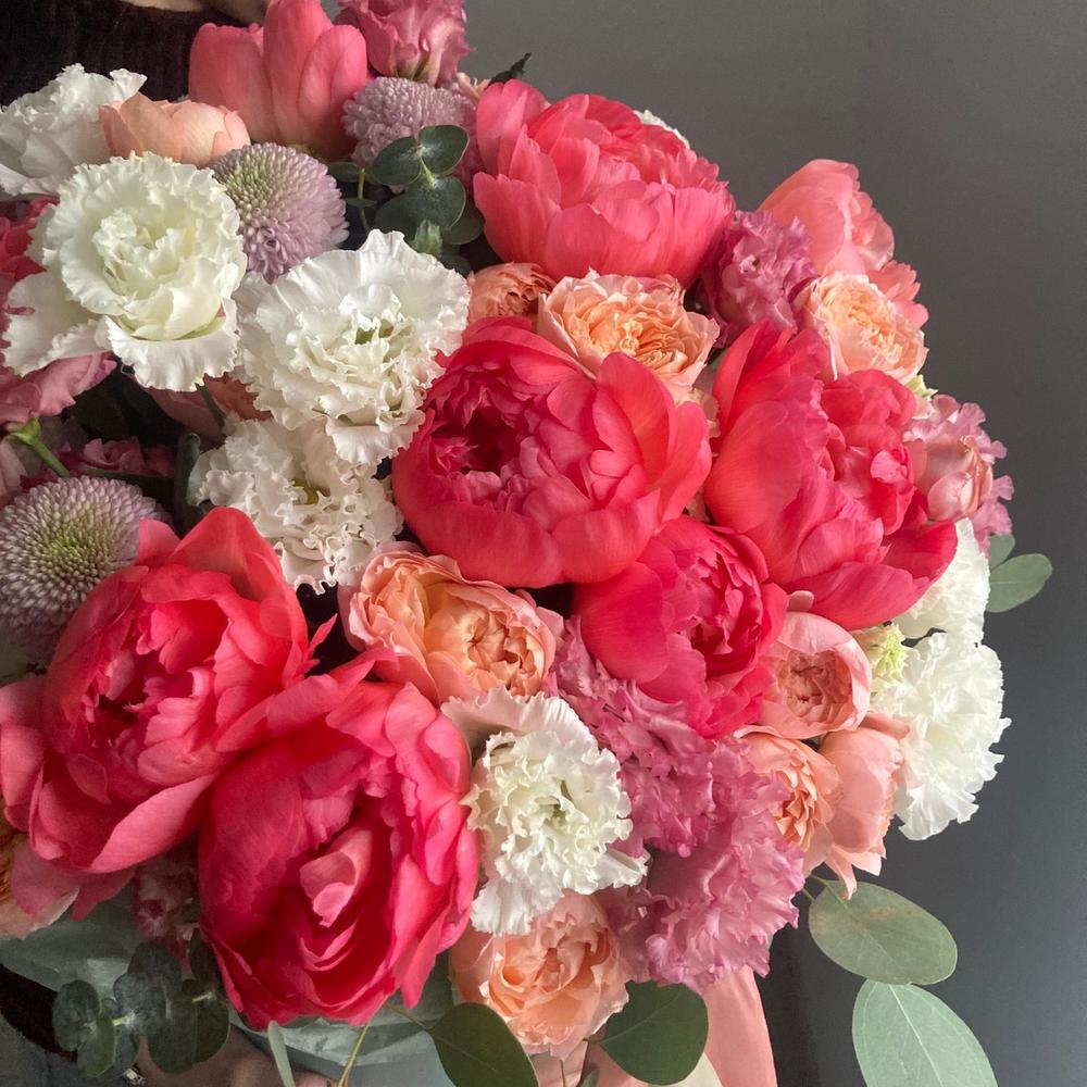 Пион – 10 шт.Роза кустовая пионовидная – 7 шт.Лизиантус – 9 шт.Гвоздика – 11 шт.Хризантема – 5 шт.Эвкалипт – 5 шт.Коробка шляпная – 1 шт.Лента атласная – 2 шт.Тишью – 2 шт.Оазис флористический – 2 шт.