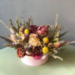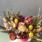 Роза Эквадор – 1 шт.Роза кустовая – 1 шт.Роза пионовидная – 1 шт.Роза – 1 шт.Гвоздика – 1 шт.зелень декоративная – 10 шт.Коробка шляпная – 1 шт.Тишью – 13 шт.