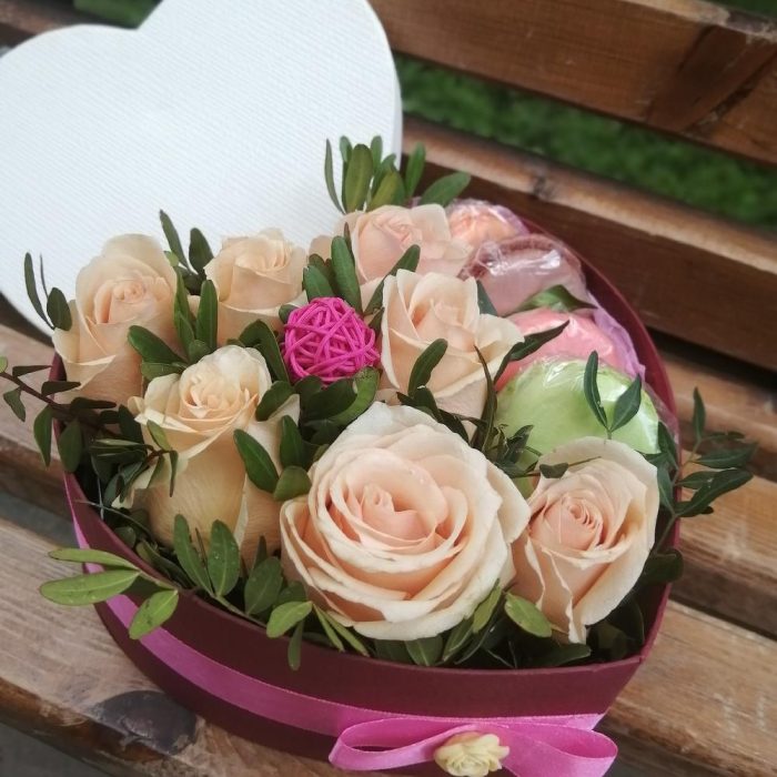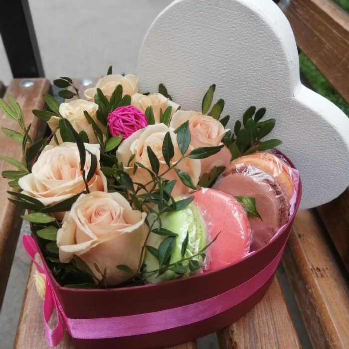 Коробка сердце с цветами и пирожными
