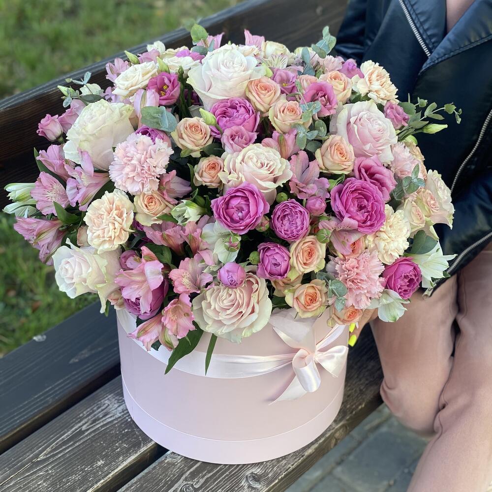 Композиция из кустовых и одноголовых роз, эустомы, альстромерии, диантуса и эвкалипта!
