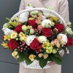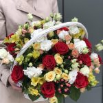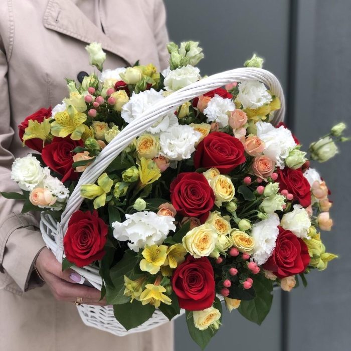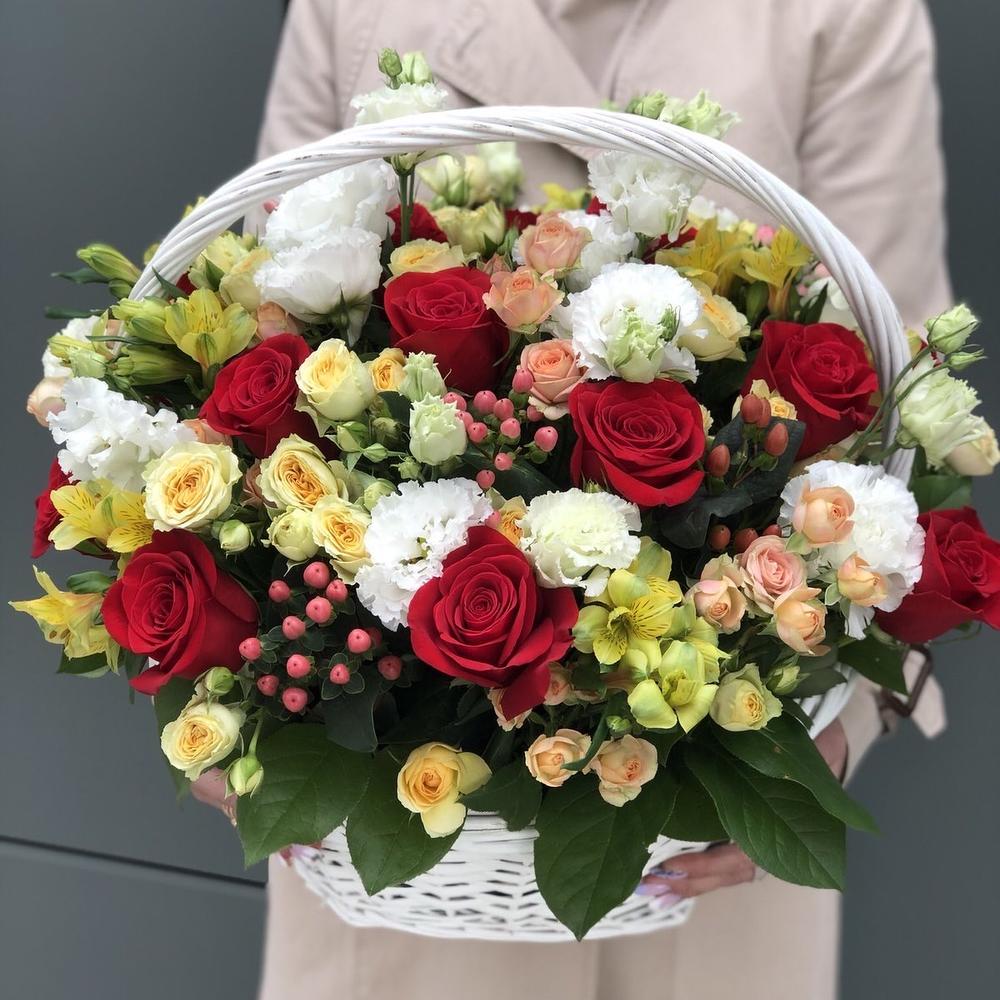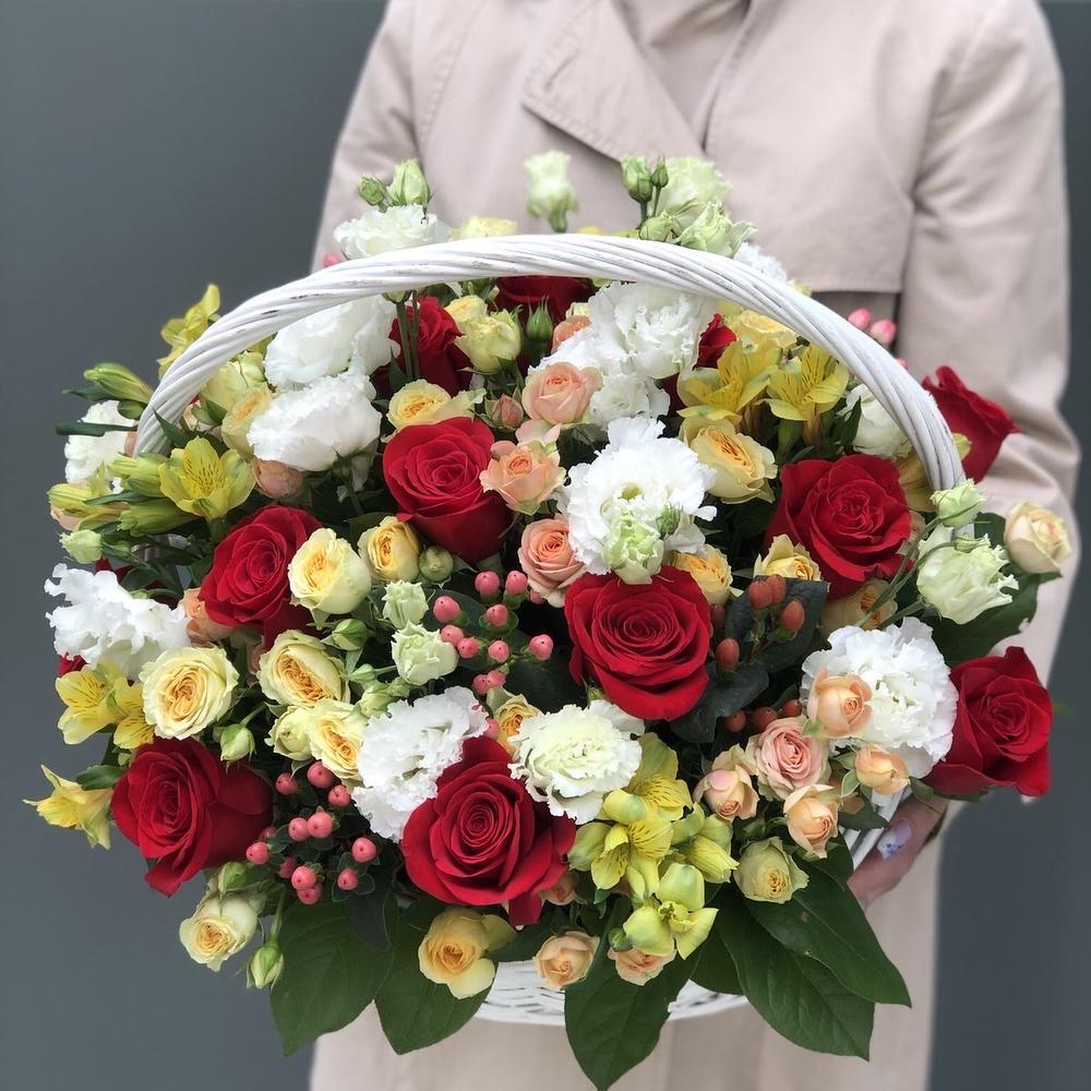 Эустома – 5 шт. Салал – 6 шт. роза красная фридом – 15 шт. Оазис – 3 шт. кустовая роза бандолеро – 5 шт. кустовая роза азора – 8 шт. Гиперикум – 5 шт. Альстромерия – 6 шт. Корзина – 1 шт. Оформление – 1 шт.