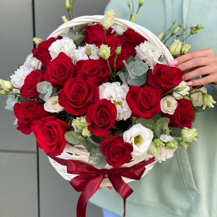 красная роза фридом – 29 шт. Эустома – 6 шт. Эвкалипт – 3 шт. Оазис – 4 шт. Оформление – 1 шт. Корзина – 1 шт.