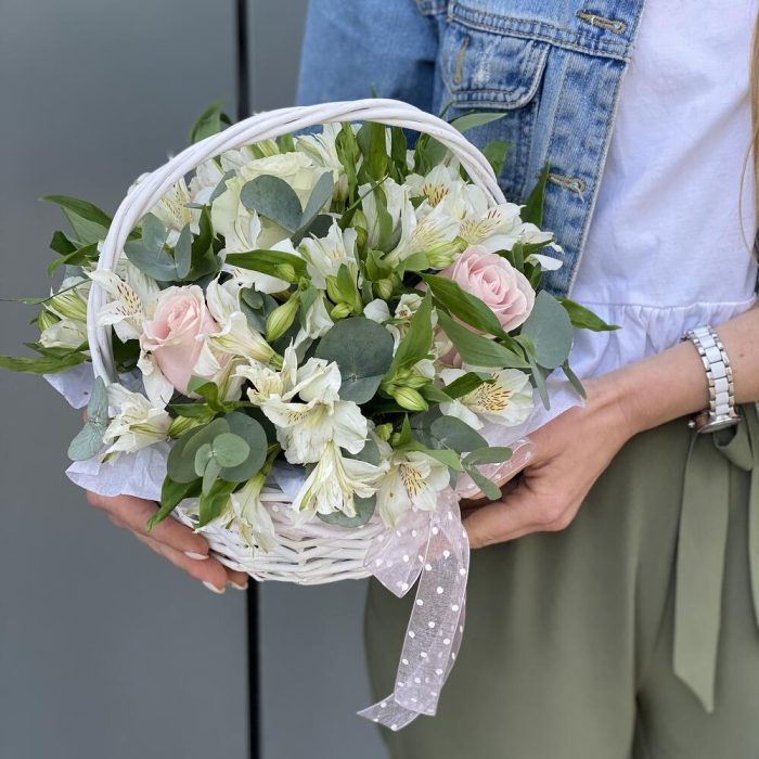 Корзинка из роз и альстромерии с эвкалиптом!