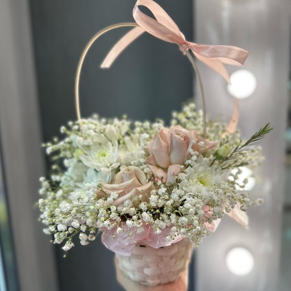 Гипсофила – 4 шт.Хризантема кустовая – 1 шт.Роза – 2 шт.Лента атласная – 1 шт.Тишью – 2 шт.Пленка – 1 шт.Корзина плетеная – 1 шт.Оазис флористический – 1 шт.