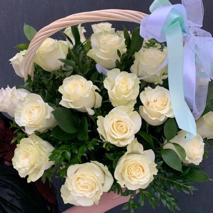 Корзина с 25 белыми розами «Аваланш»