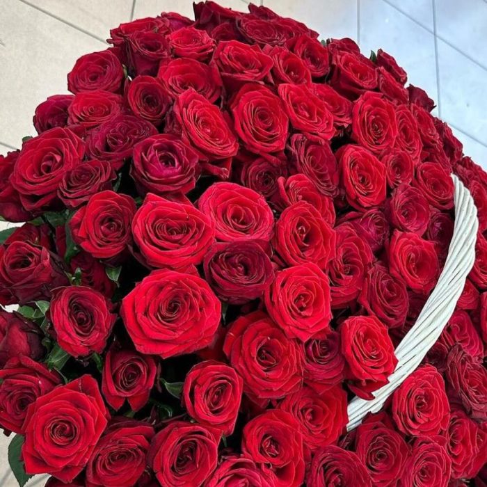 Роза Голландская – 151 шт. Корзина плетеная – 1 шт.