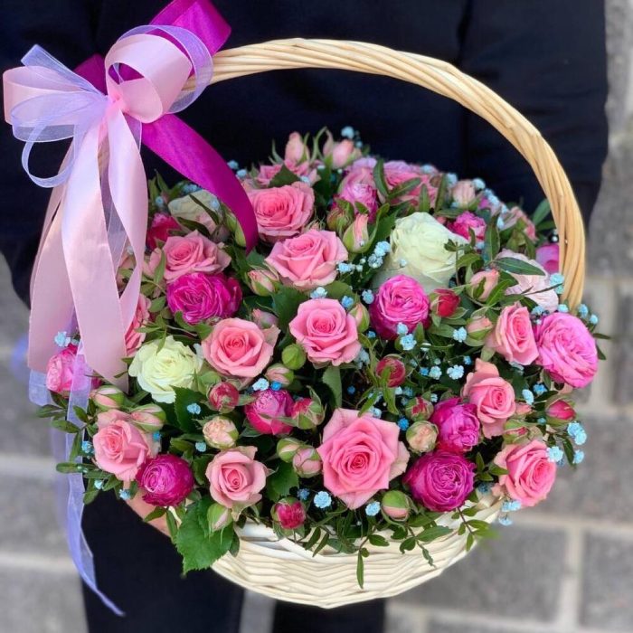Корзина плетеная – 1 шт.Оазис флористический – 2 шт.Лента атласная – 2 шт.Фисташка – 2 шт.Роза Эквадор – 3 шт.Гипсофила – 1 шт.Роза кустовая – 5 шт.