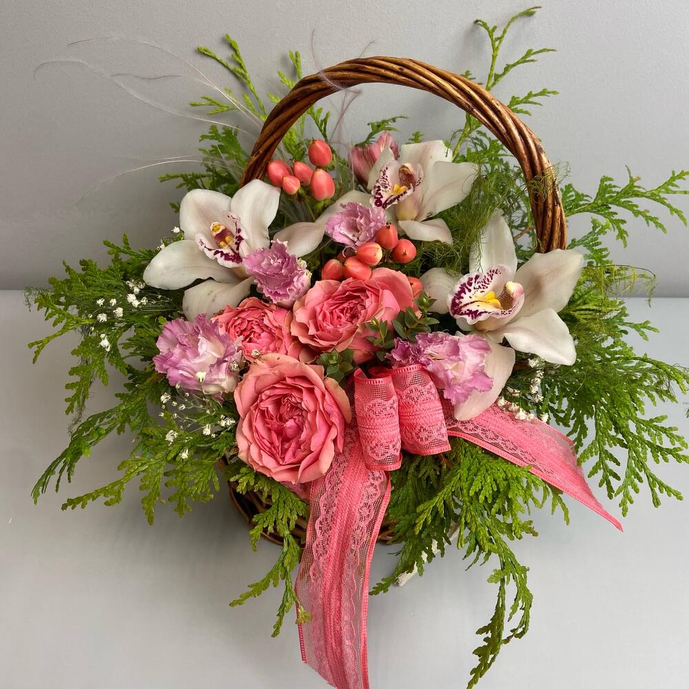 Гипсофила – 1 шт.орхидея – 3 шт.Лизиантус – 1 шт.Роза пионовидная – 3 шт.Корзина плетеная – 1 шт.Оазис флористический – 1 шт.декор бант – 1 шт.туя ветка – 1 шт.аспарагус пучок – 1 шт.Гиперикум – 2 шт.