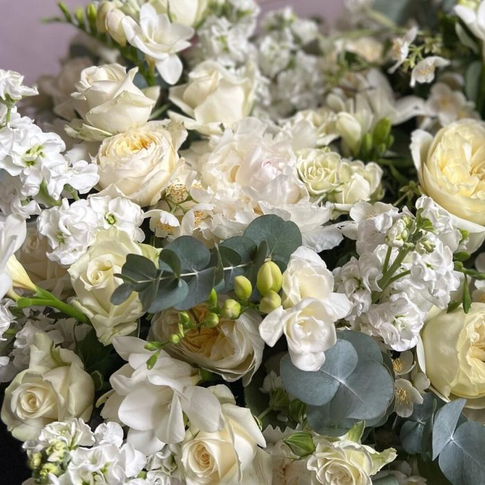Роза – 21 шт.Пион – 1 шт.Роза пионовидная – 7 шт.Фрезия – 28 шт.Маттиола – 35 шт.Гвоздика – 15 шт.Эвкалипт – 13 шт.Корзина плетеная – 1 шт.Флористическая губка – 3 шт.