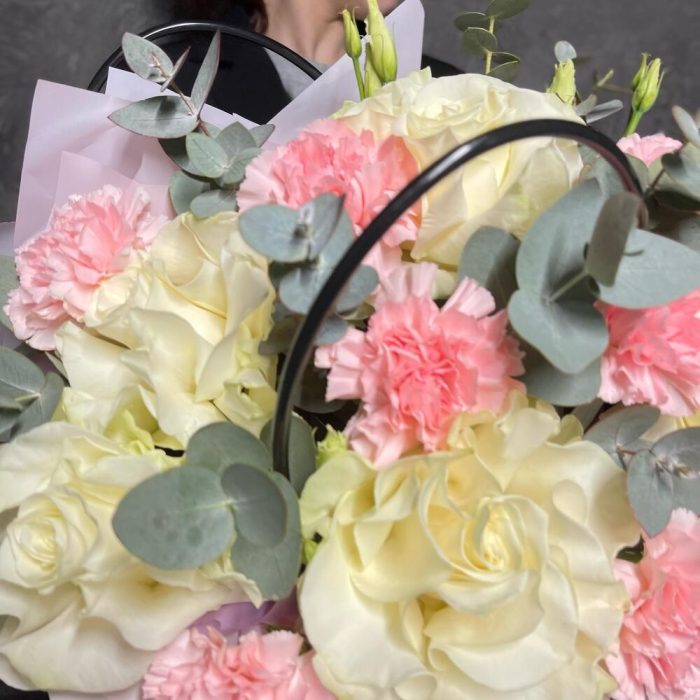 Лента – 2 шт.Эвкалипт – 7 шт.Диантус – 7 шт.Роза Мондиаль – 5 шт.Сумка – 1 шт.Оазис флористический – 1 шт.