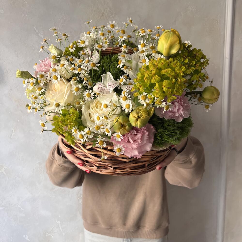 Альстромерия – 2 шт.Корзина – 1 шт.Лизиантус – 1 шт.Тюльпан – 4 шт.Роза – 3 шт.Гвоздика – 3 шт.Оазис – 1 шт.Матрикария – 7 шт.Молочай – 4 шт.гринтрик – 4 шт.