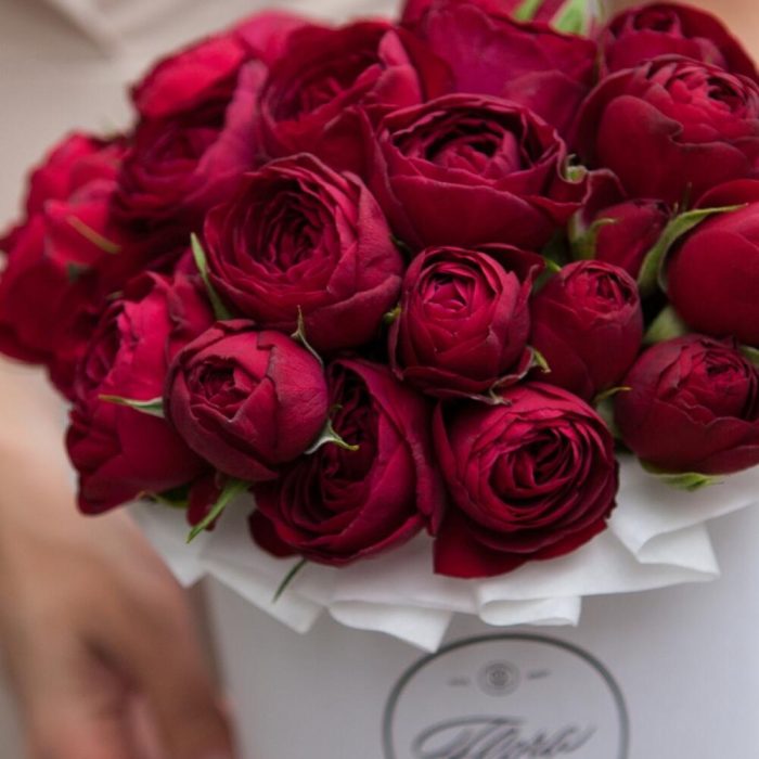 Шляпная коробка – 1 шт.Пионовидная кустовая роза – 15 шт.Флористическая губка (оазис) – 1 шт.