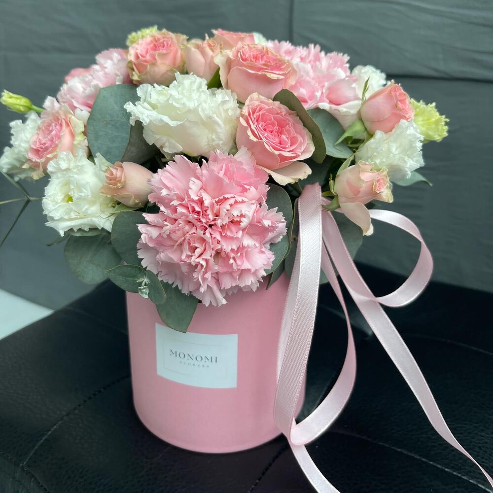 Роза садовая кустовая – 2 шт.Диантус – 3 шт.Эустома – 2 шт.Эвкалипт – 3 шт.Оазис флористический – 1 шт.Шляпная коробка – 1 шт.Лента атласная – 1 шт.наклейка фирменная – 1 шт.