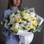 Роза пионовидная кустовая – 2 шт.Вибурнум – 2 шт.Ахиллея – 2 шт.Флокс – 2 шт.Эвкалипт – 5 шт.Тишью – 2 шт.Бумага – 2 шт.Лента атласная – 2 шт.