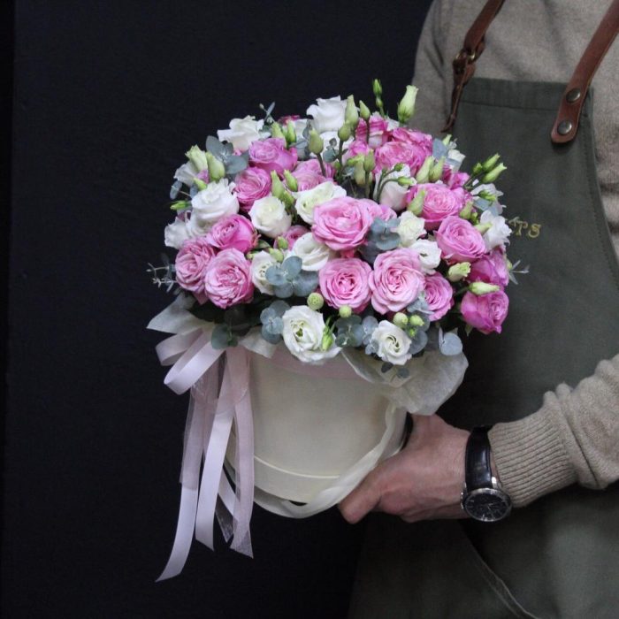 Пионовидная кустовая роза – 7 шт.эустома белая – 5 шт.Коробка шляпная – 1 шт.Оазис флористический – 1 шт.Эвкалипт Baby Blue – 5 шт.Лента атласная – 3 шт.