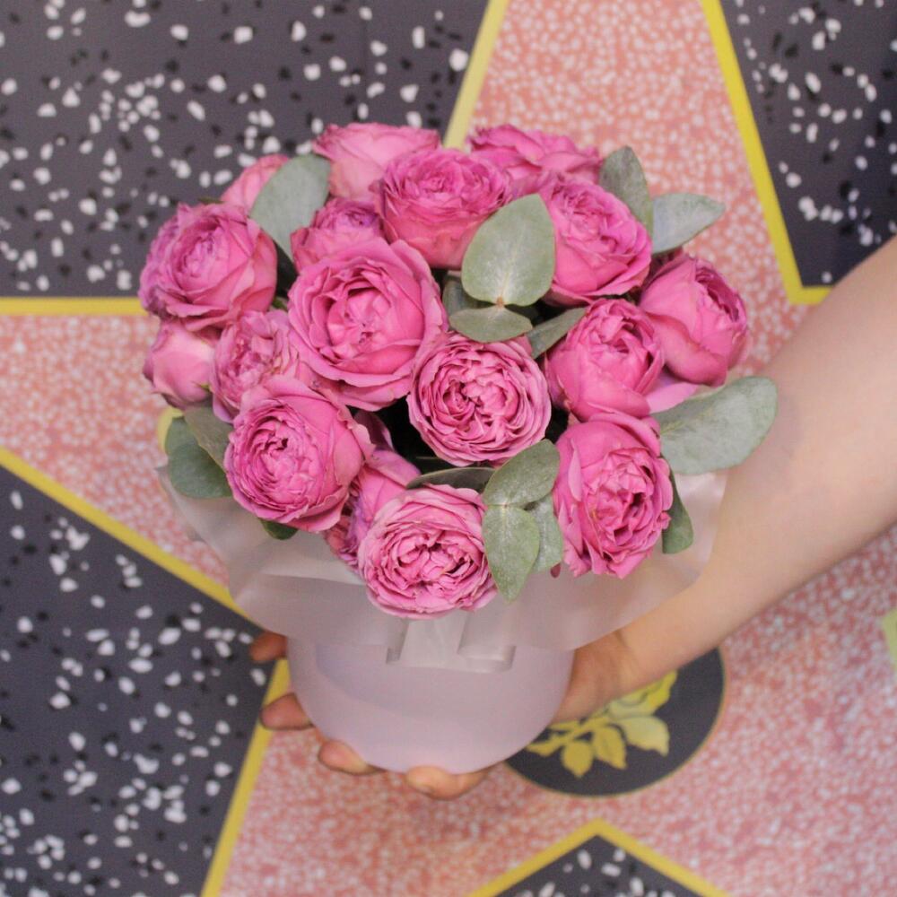 Эвкалипт – 2 шт.Коробка шляпная – 1 шт.Оазис флористический – 1 шт.Пленка дизайнерская – 1 шт.роза кустовая пионовидная мисти бабл – 7 шт.