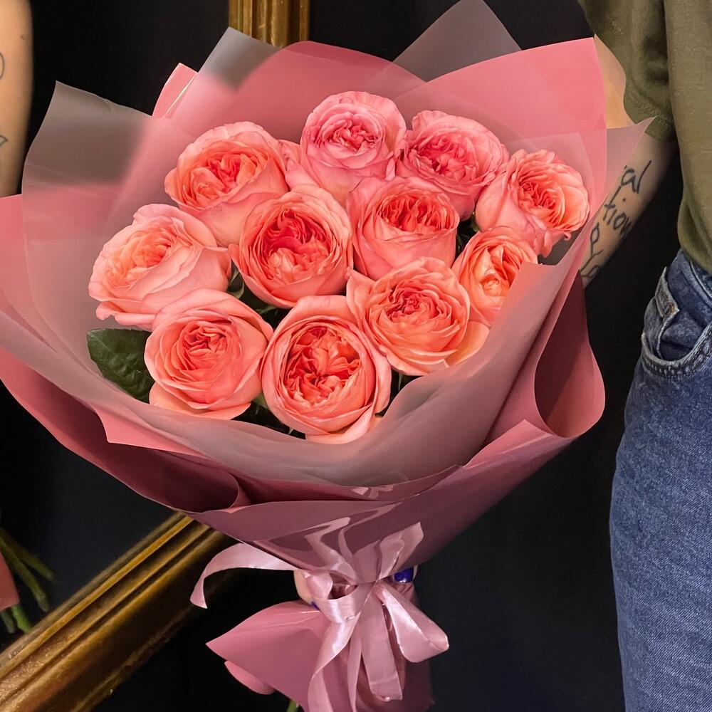 Лента атласная – 2 шт.Роза пионовидная – 11 шт.Упаковка дизайнерская – 3 шт.