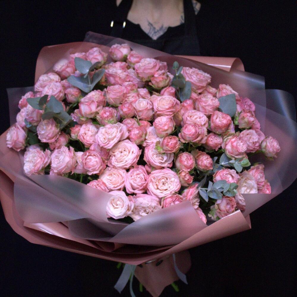 Роза кустовая пионовидная мадам бомбастик – 25 шт.Эвкалипт – 3 шт.Пленка дизайнерская – 3 шт.Лента атласная – 1 шт.