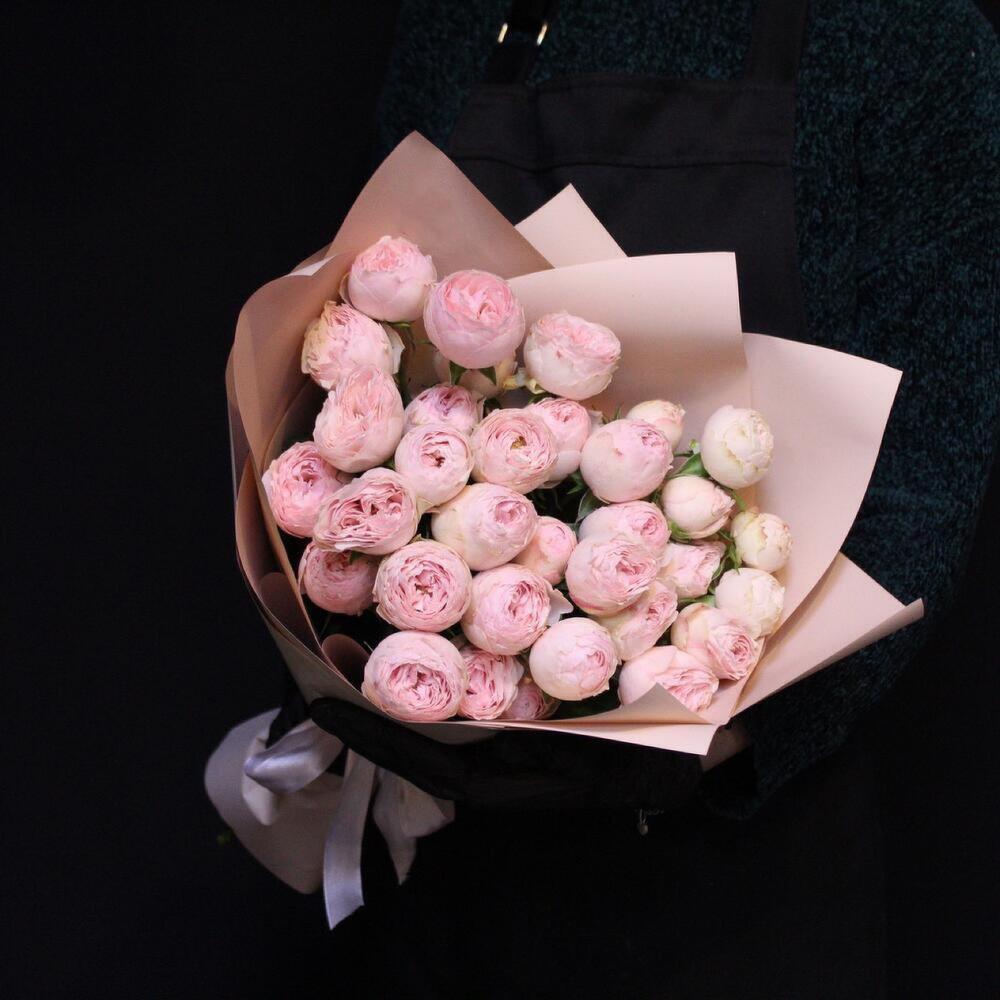 Лента атласная – 1 шт.Пленка дизайнерская – 2 шт.роза кустовая пионовидная мансфилд парк – 9 шт.