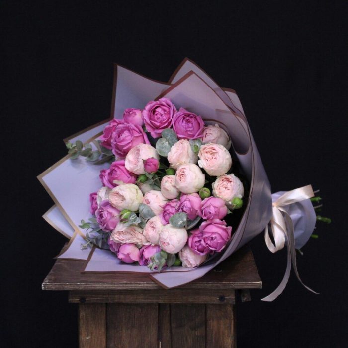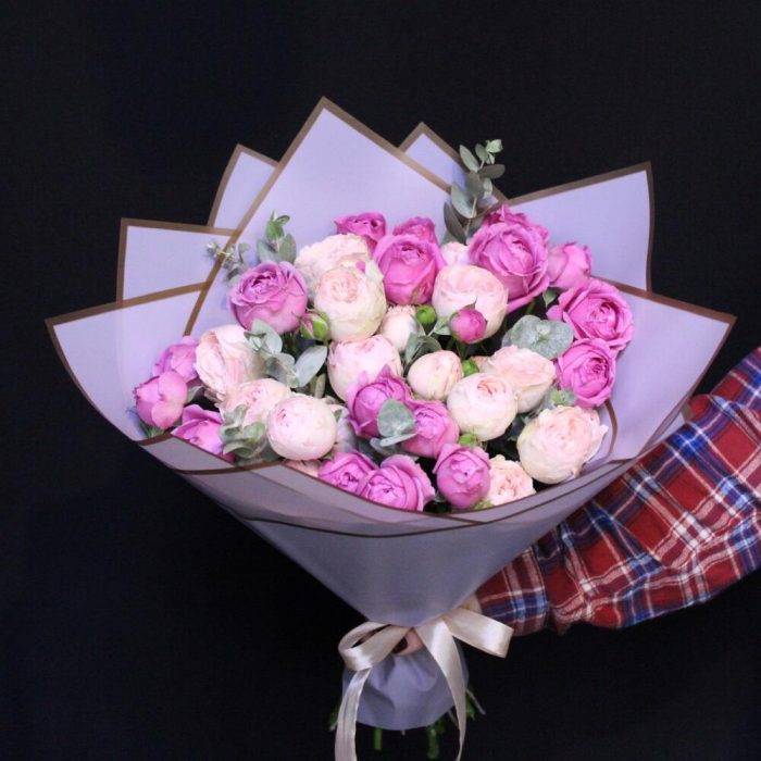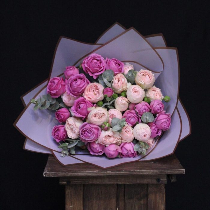 Эвкалипт – 2 шт.Пленка дизайнерская – 1 шт.роза кустовая пионовидная мансфилд парк – 5 шт.роза кустовая пионовидная мисти бабл – 4 шт.