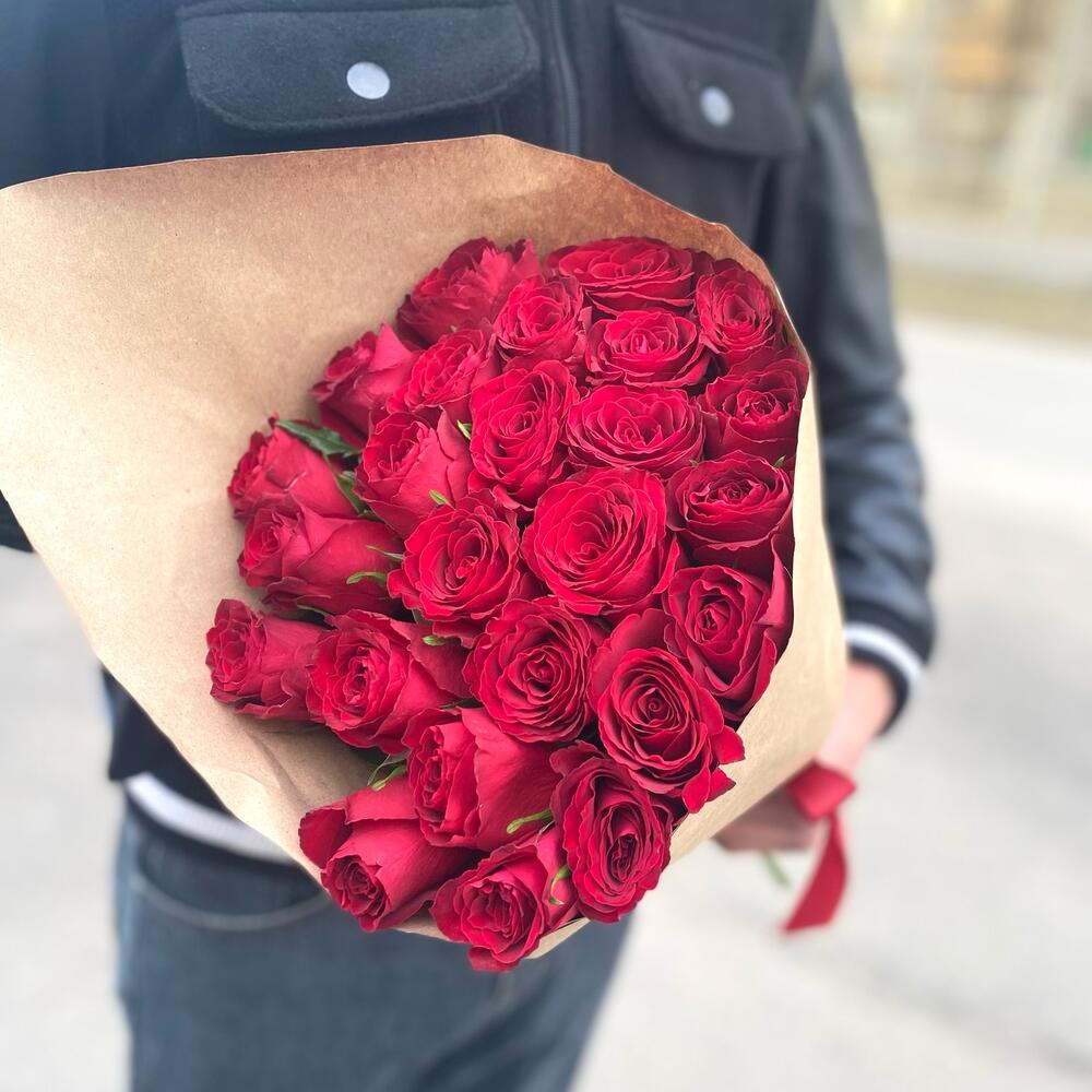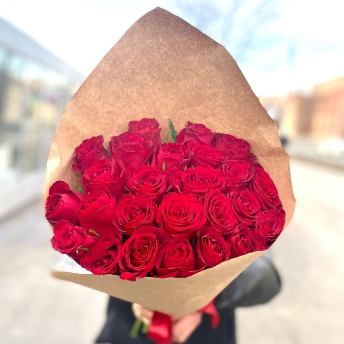 Роза красная – 25 шт.Крафт упаковка – 1 шт.Лента атласная – 1 шт.