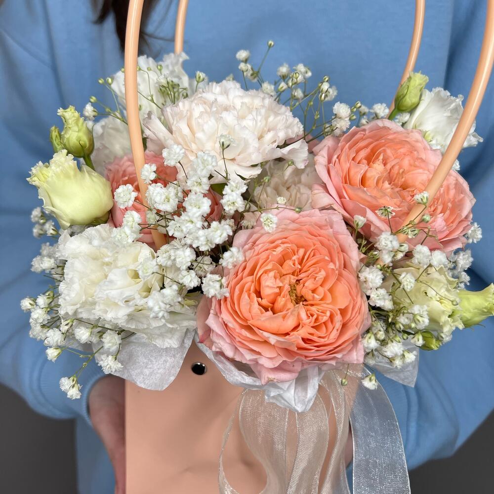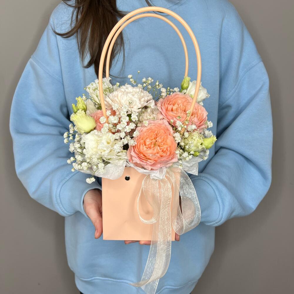 Гипсофила – 1 шт.Лизиантус – 1 шт.Диантус – 2 шт.Роза кустовая пионовидная – 1 шт.Сумочка – 1 шт.комплимент от polyanka – 1 шт.