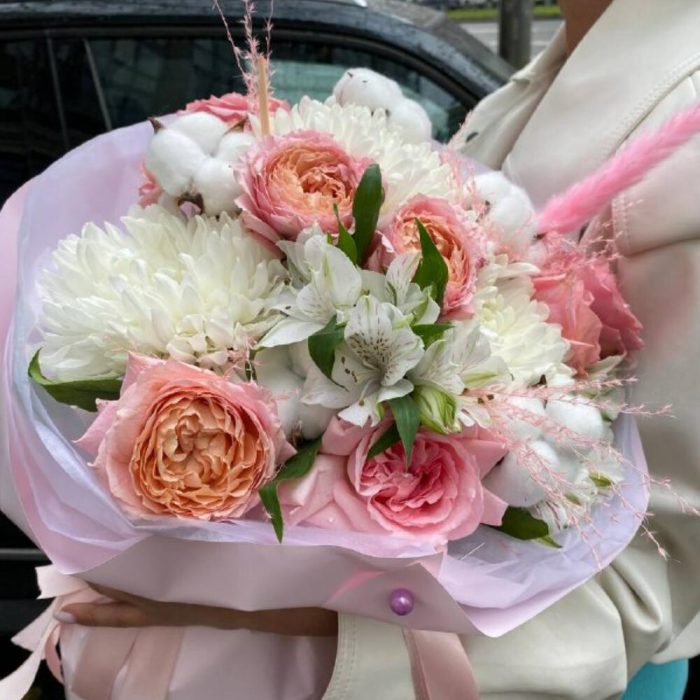 Хризантема – 3 шт.Роза Джульетта – 4 шт.Хлопок – 5 шт.Альстромерия – 2 шт.камыш – 1 шт.Упаковка – 4 шт.