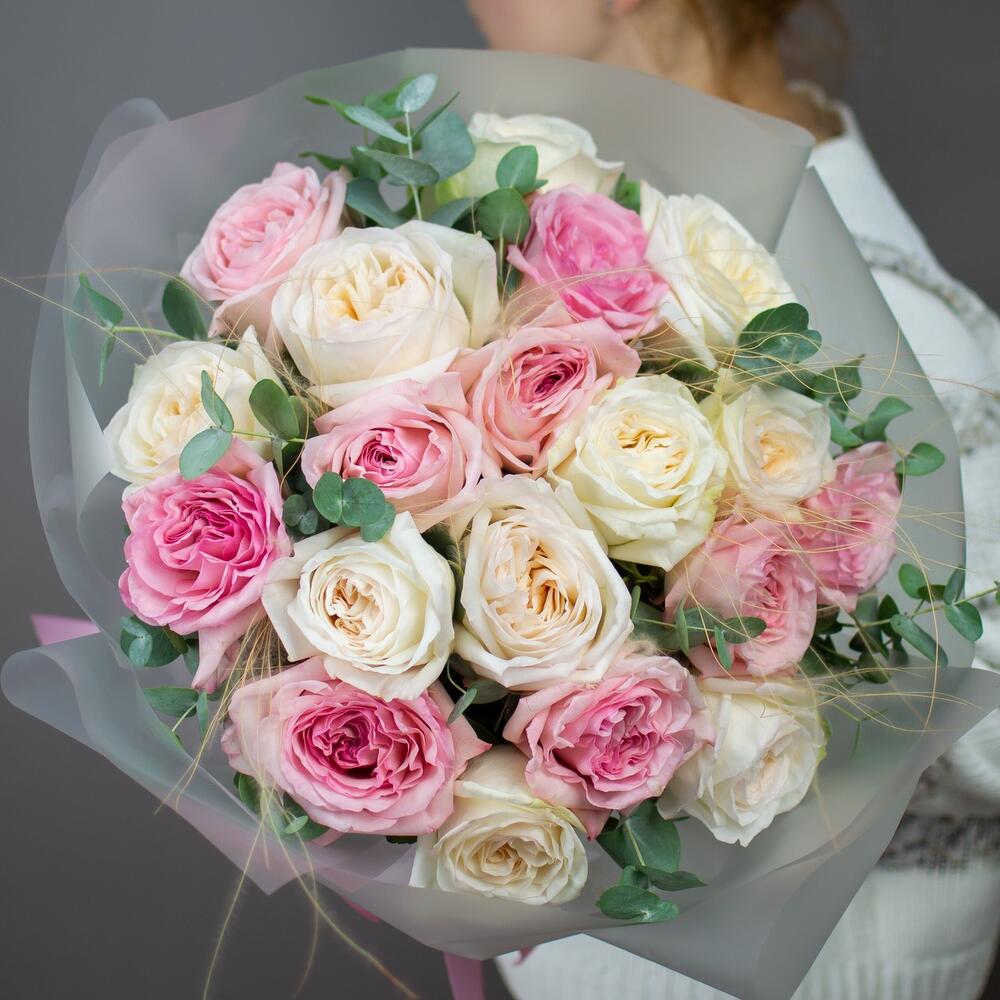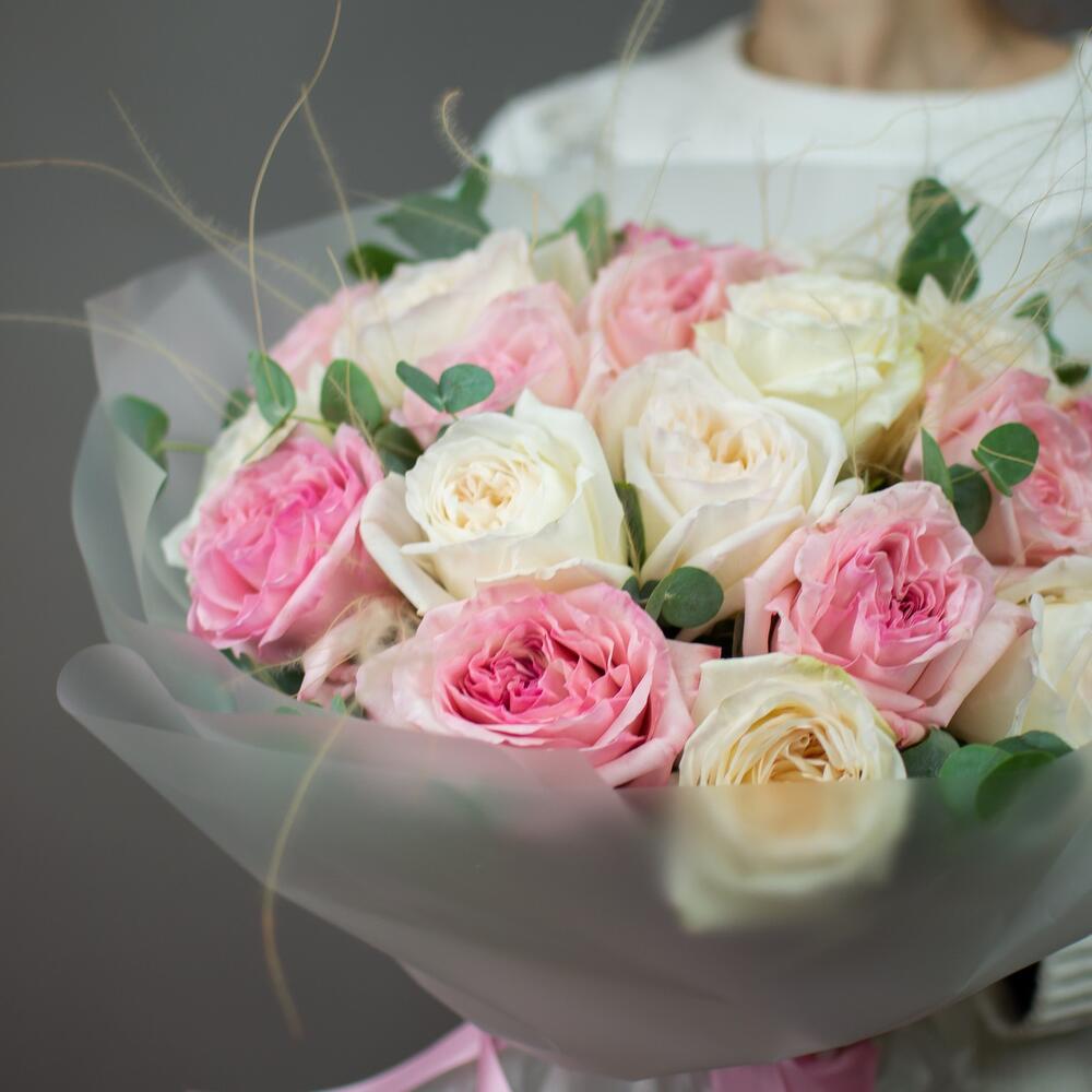 Эвкалипт – 2 шт.Упаковка дизайнерская – 1 шт.Стифа – 3 шт.роза ароматная охара – 19 шт.