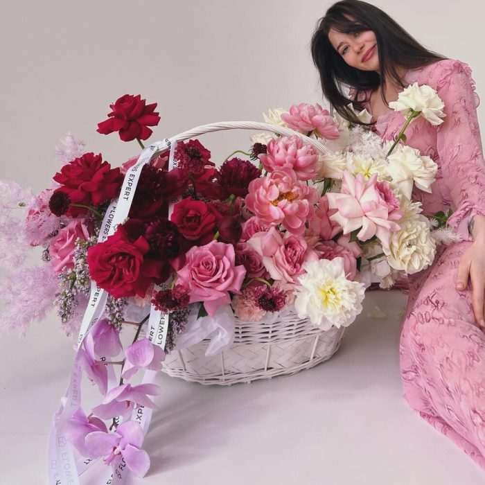 Пион – 5 шт.Сирень – 5 шт.Корзина плетеная – 1 шт.Французская роза – 19 шт.Фаленопсис – 1 шт.