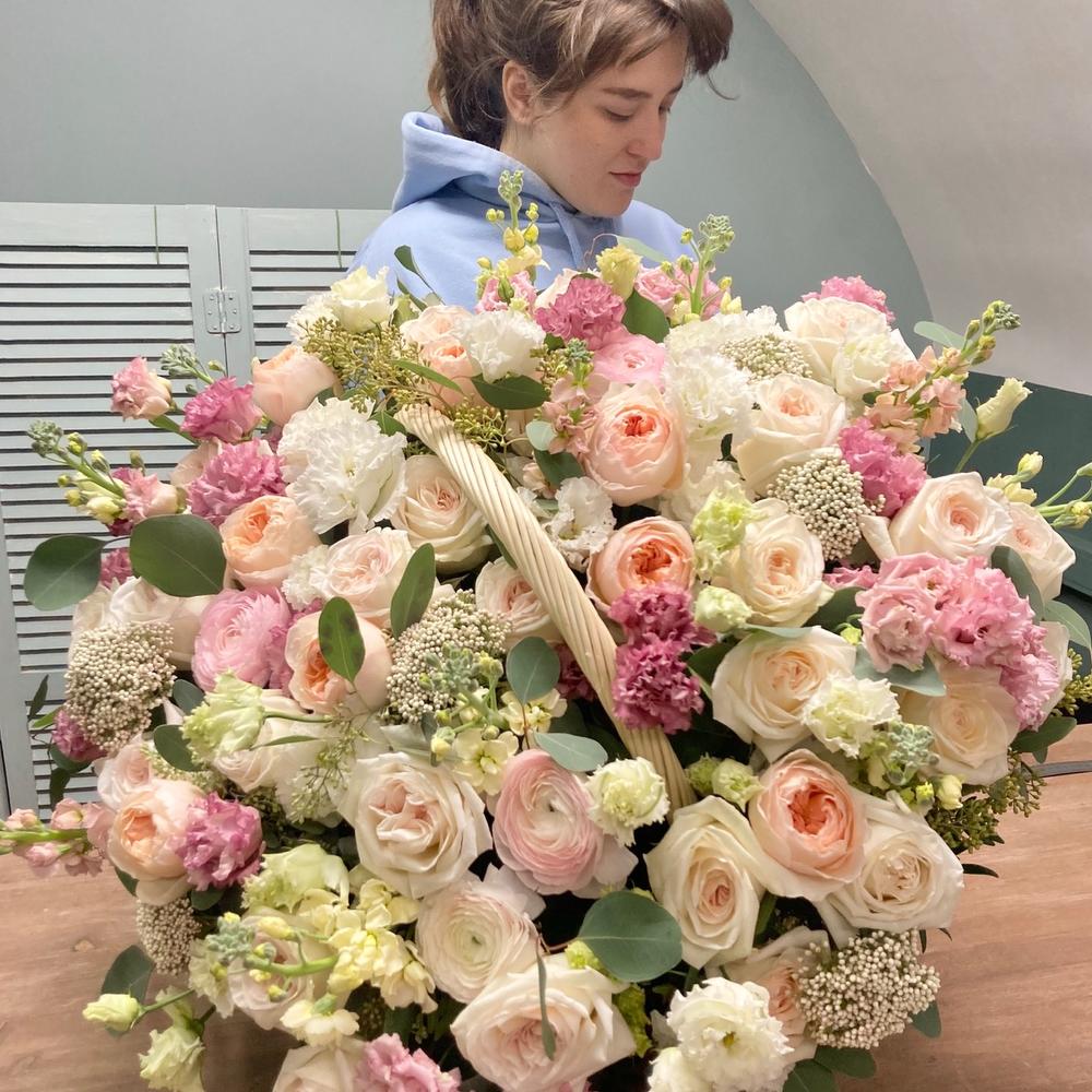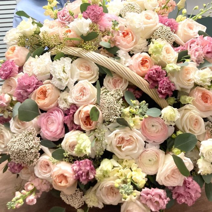 роза пионовидная juliet – 25 шт.Ранункулюс – 25 шт.роза пионовидная o’hara – 25 шт.Озотамнус – 15 шт.Маттиола – 25 шт.Лизиантус – 25 шт.Эвкалипт – 25 шт.Фисташка – 7 шт.Оазис флористический – 6 шт.Корзина – 1 шт.Пион белый – 9 шт.