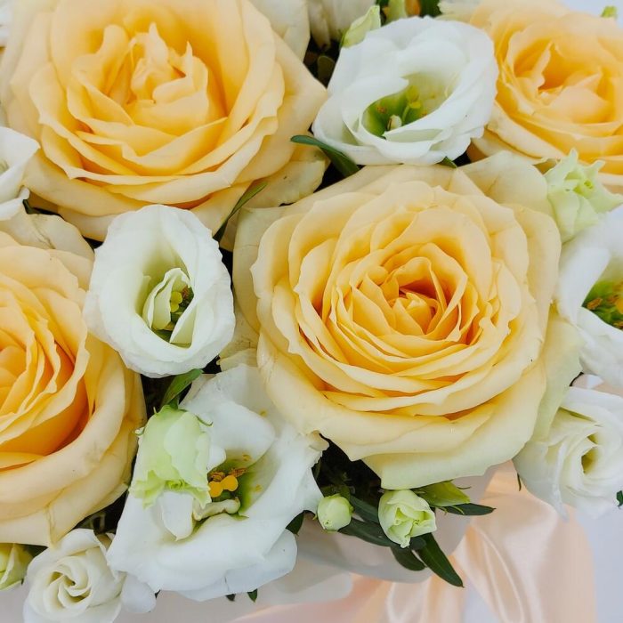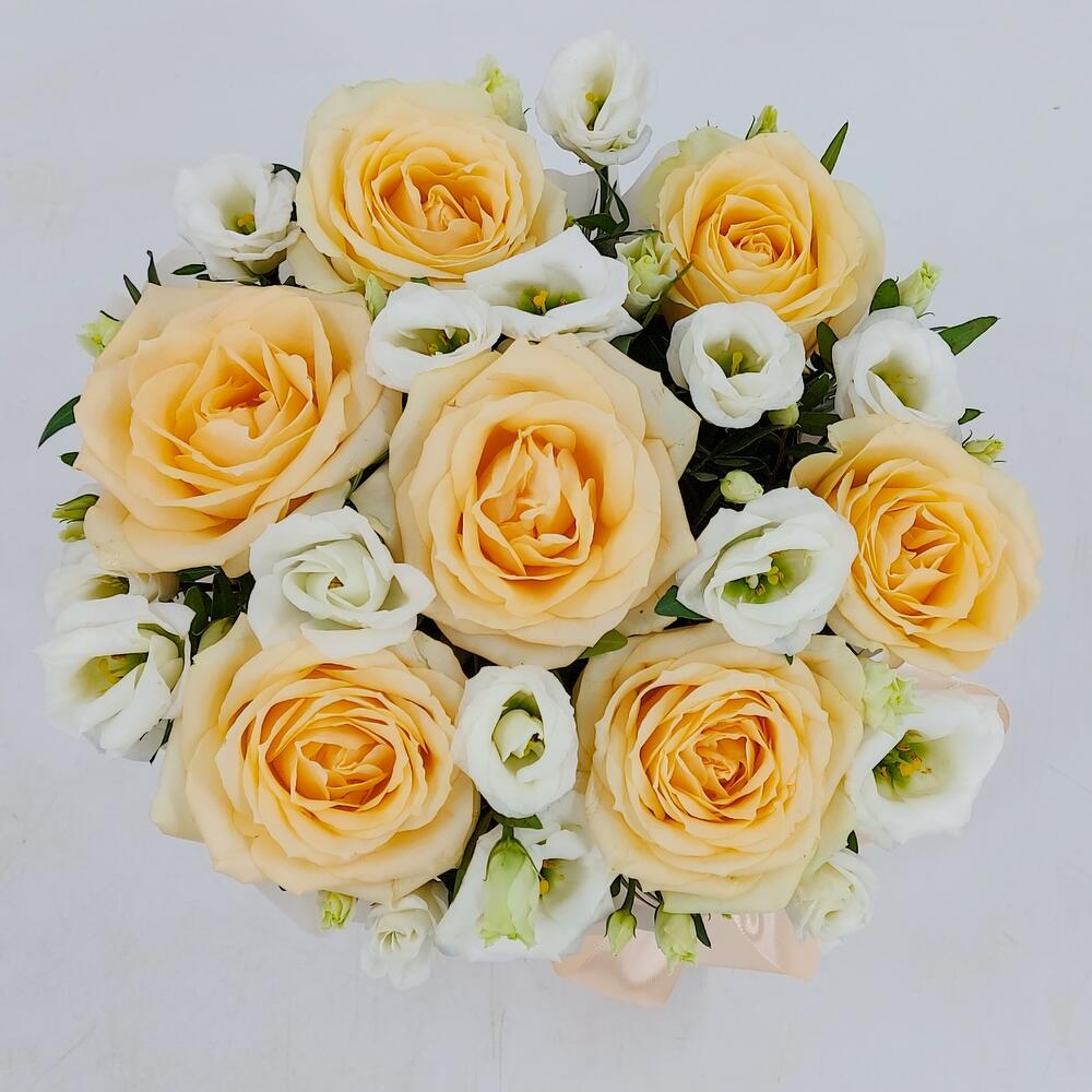 Персиковые розы с эустомой в коробке Пич