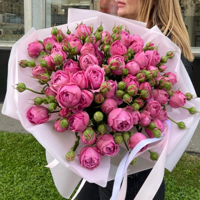 упаковка дизайнерская пленка – 5 шт.бант атласный двойной – 1 шт.пионовидная роза кустовая Misty Bubbles – 19 шт.
