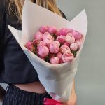 Лента атласная – 1 шт.Пленка матовая – 1 шт.silva pink кустовая роза – 5 шт.