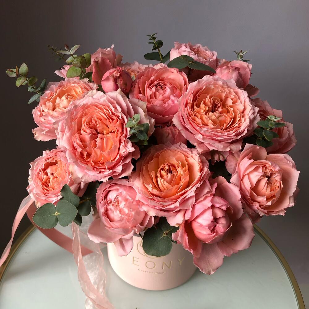 Пионовидные розы розово-персиковых оттенков с ароматным эвкалиптом Флористы студии Peony собрали данную композицию с огромным трепетом из самых свежих цветов Цветы в коробке – это удобно, так как для них не нужна ваза. Цветы находятся в специальной флористической губке, которую необходимо поливать раз в два дня В подарок к композиции прилагается открытка с вашими пожеланиями и инструкция по уходу за цветами.